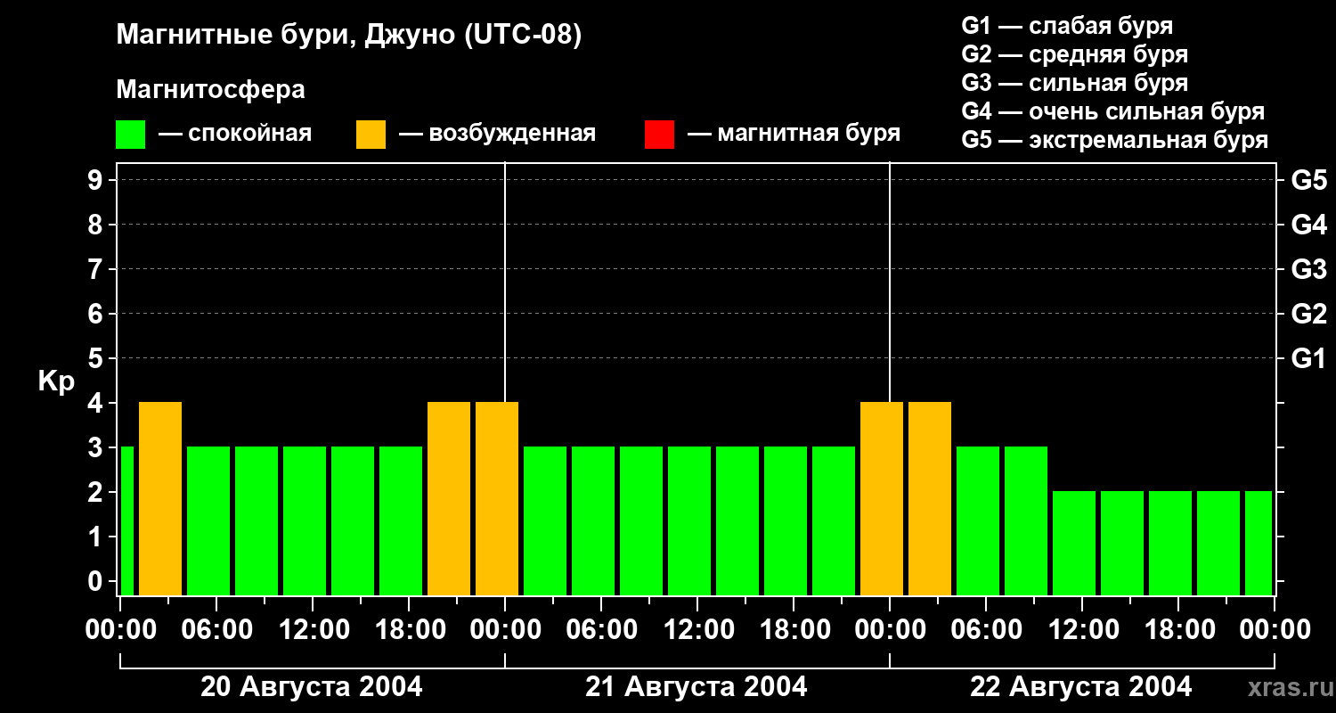 Изменения геомагнитного индекса Kp с 20 по 22 августа 2004 года для средних широт