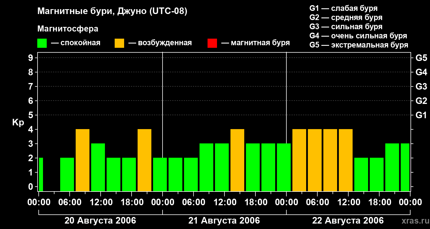 Изменения геомагнитного индекса Kp с 20 по 22 августа 2006 года для средних широт