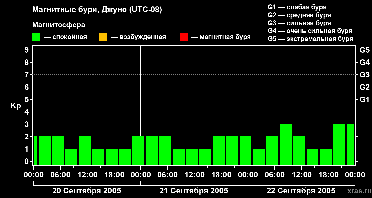 Изменения геомагнитного индекса Kp с 20 по 22 сентября 2005 года для средних широт