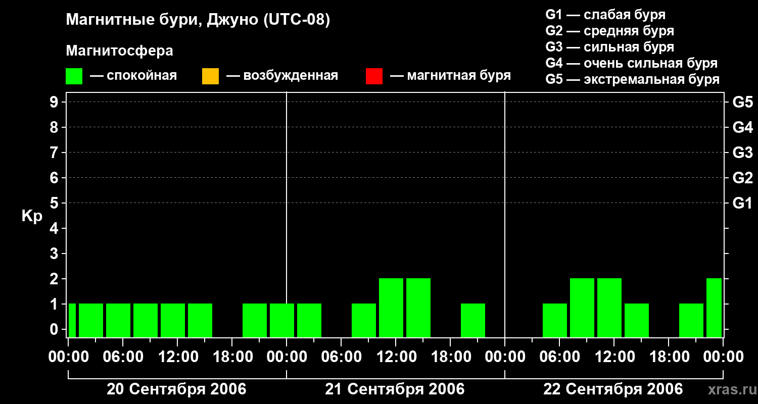Изменения геомагнитного индекса Kp с 20 по 22 сентября 2006 года для средних широт