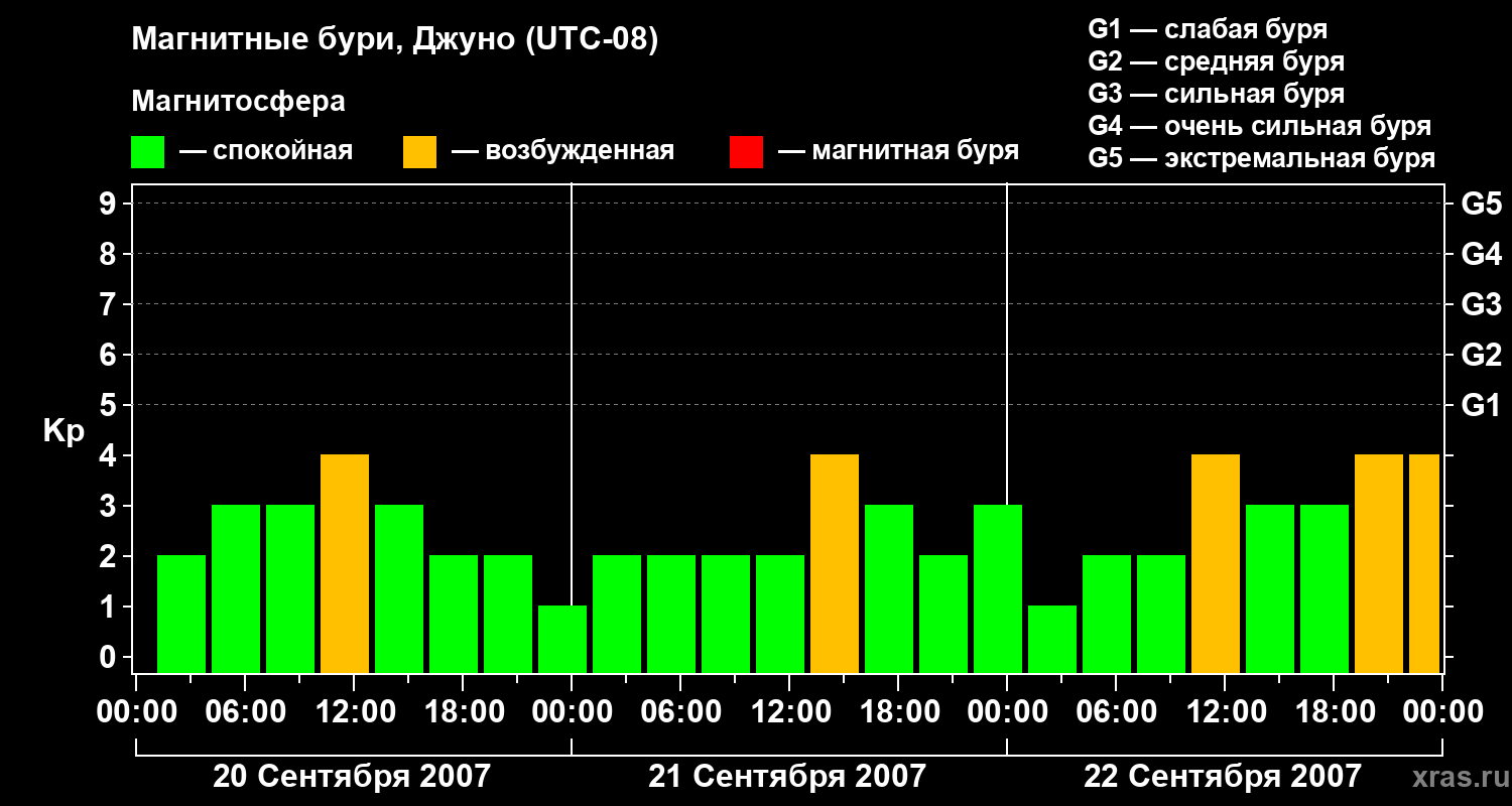 Изменения геомагнитного индекса Kp с 20 по 22 сентября 2007 года для средних широт