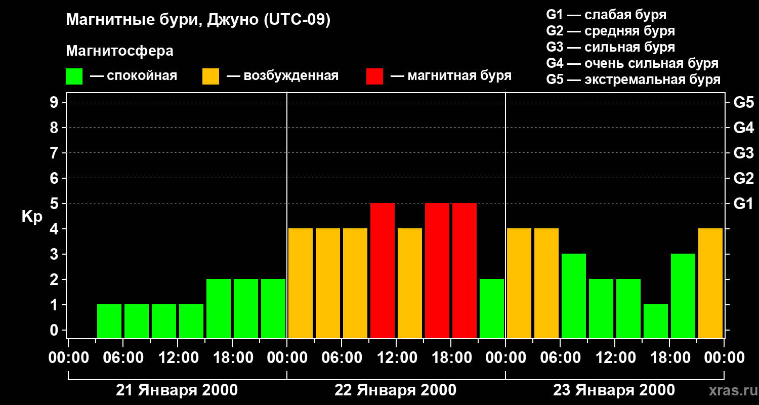 Изменения геомагнитного индекса Kp с 21 по 23 января 2000 года для средних широт