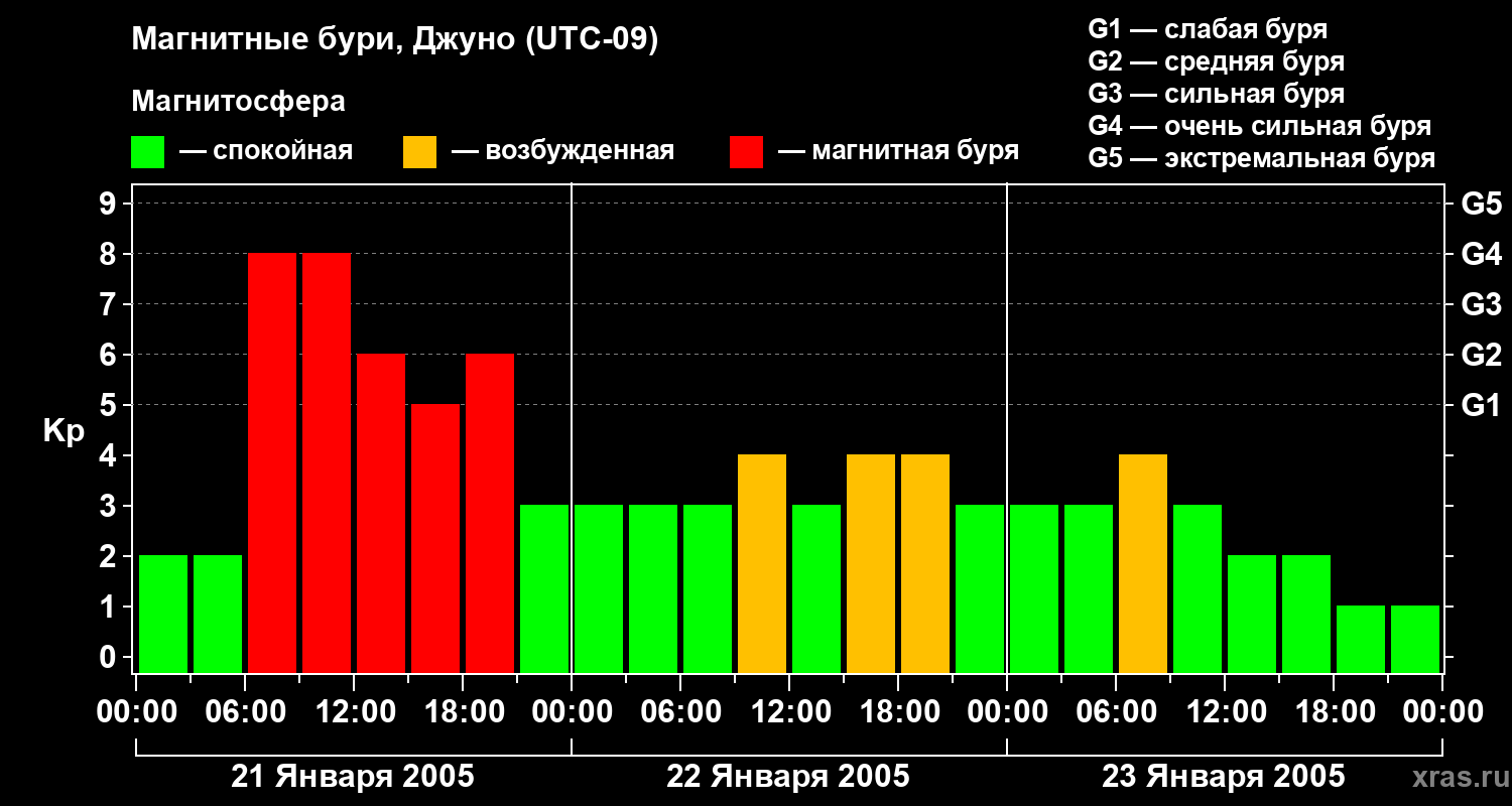 Изменения геомагнитного индекса Kp с 21 по 23 января 2005 года для средних широт