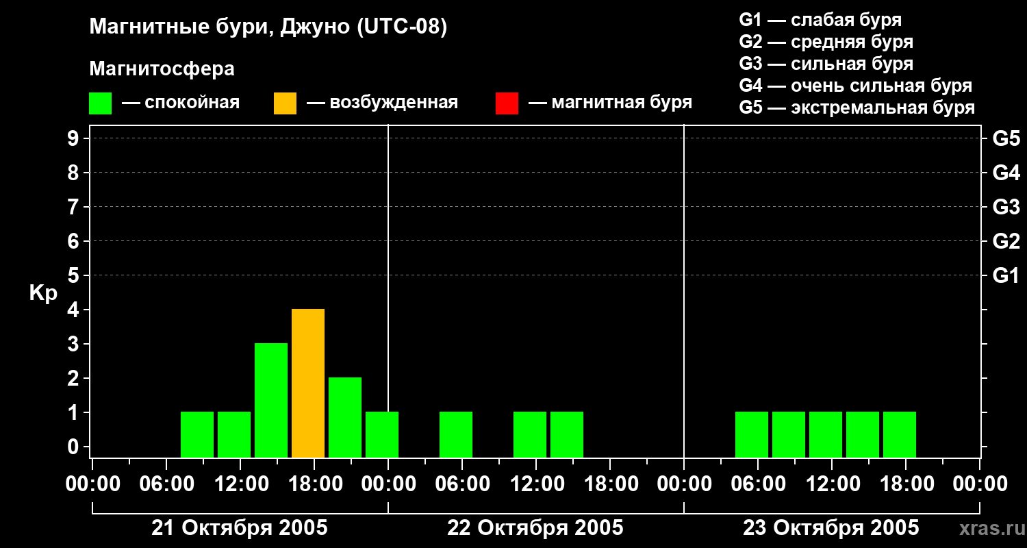 Изменения геомагнитного индекса Kp с 21 по 23 октября 2005 года для средних широт