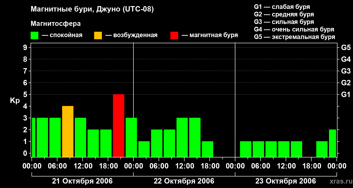 Изменения геомагнитного индекса Kp с 21 по 23 октября 2006 года для средних широт