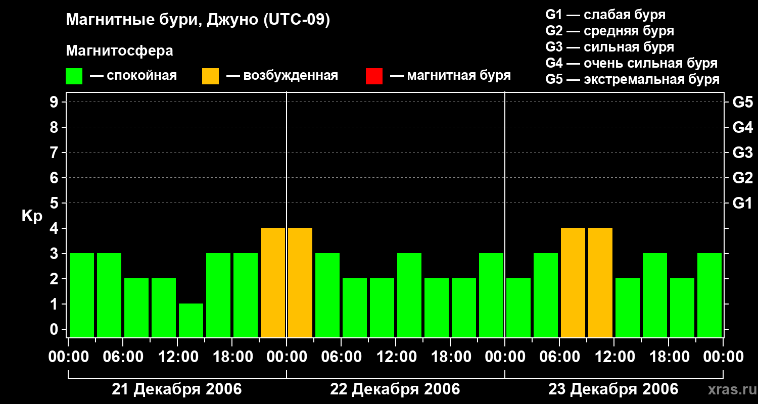 Изменения геомагнитного индекса Kp с 21 по 23 декабря 2006 года для средних широт