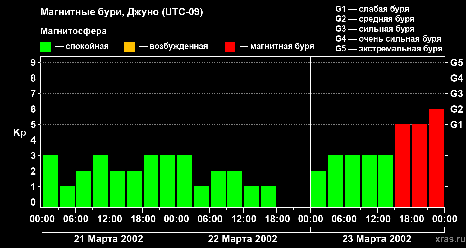 Изменения геомагнитного индекса Kp с 21 по 23 марта 2002 года для средних широт