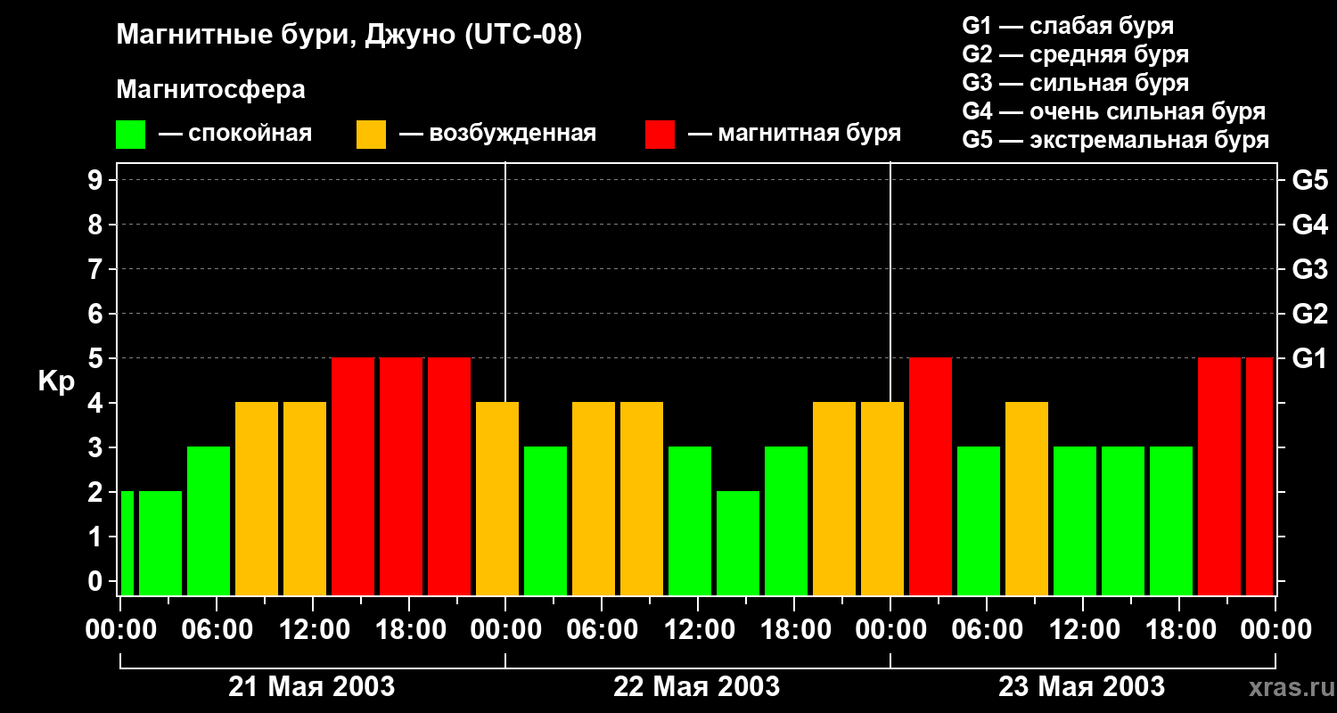 Изменения геомагнитного индекса Kp с 21 по 23 мая 2003 года для средних широт