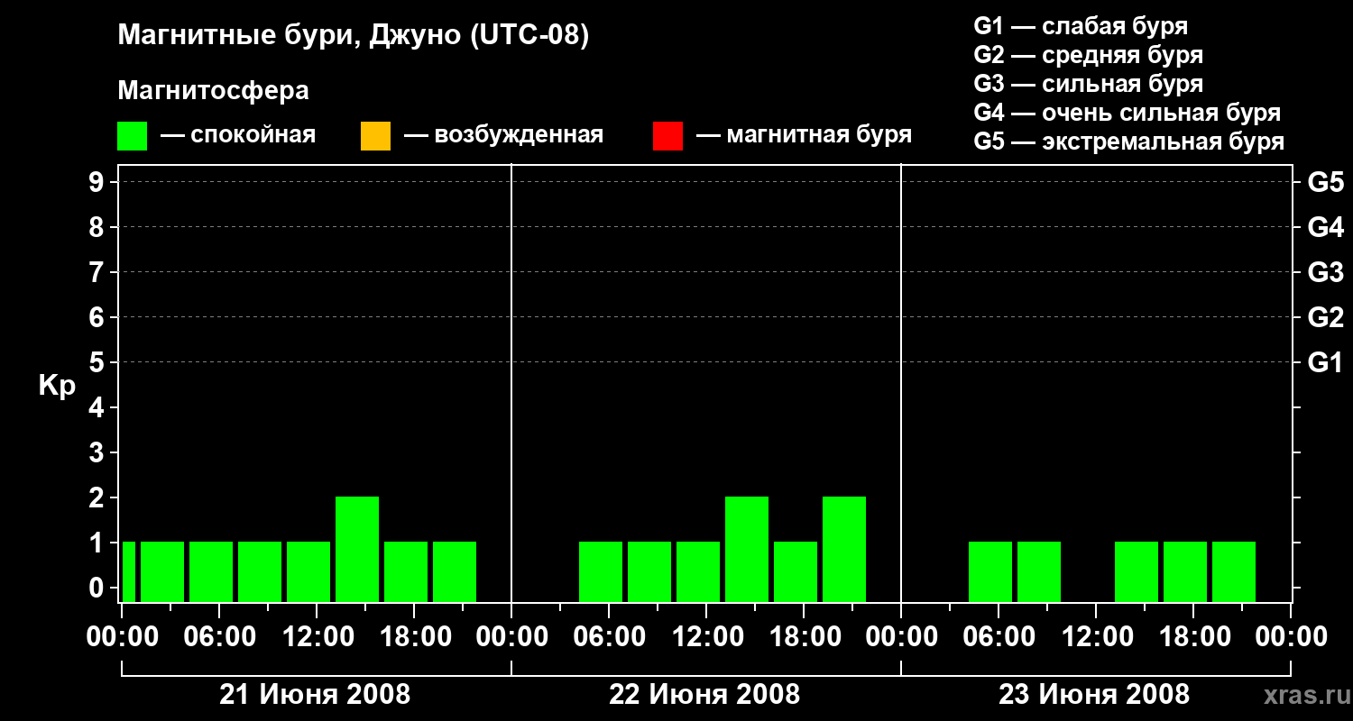 Изменения геомагнитного индекса Kp с 21 по 23 июня 2008 года для средних широт