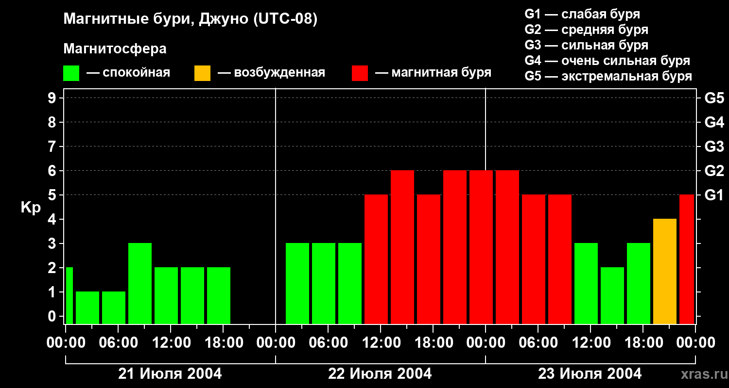 Изменения геомагнитного индекса Kp с 21 по 23 июля 2004 года для средних широт
