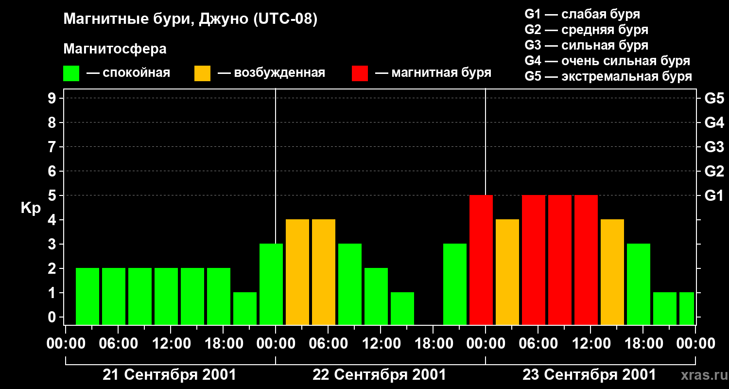 Изменения геомагнитного индекса Kp с 21 по 23 сентября 2001 года для средних широт