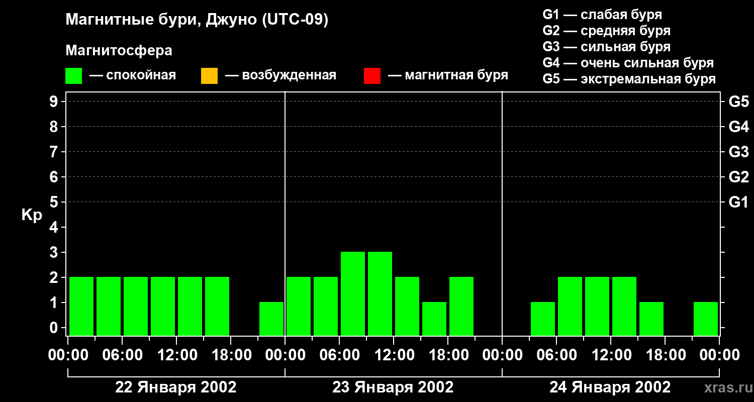 Изменения геомагнитного индекса Kp с 22 по 24 января 2002 года для средних широт