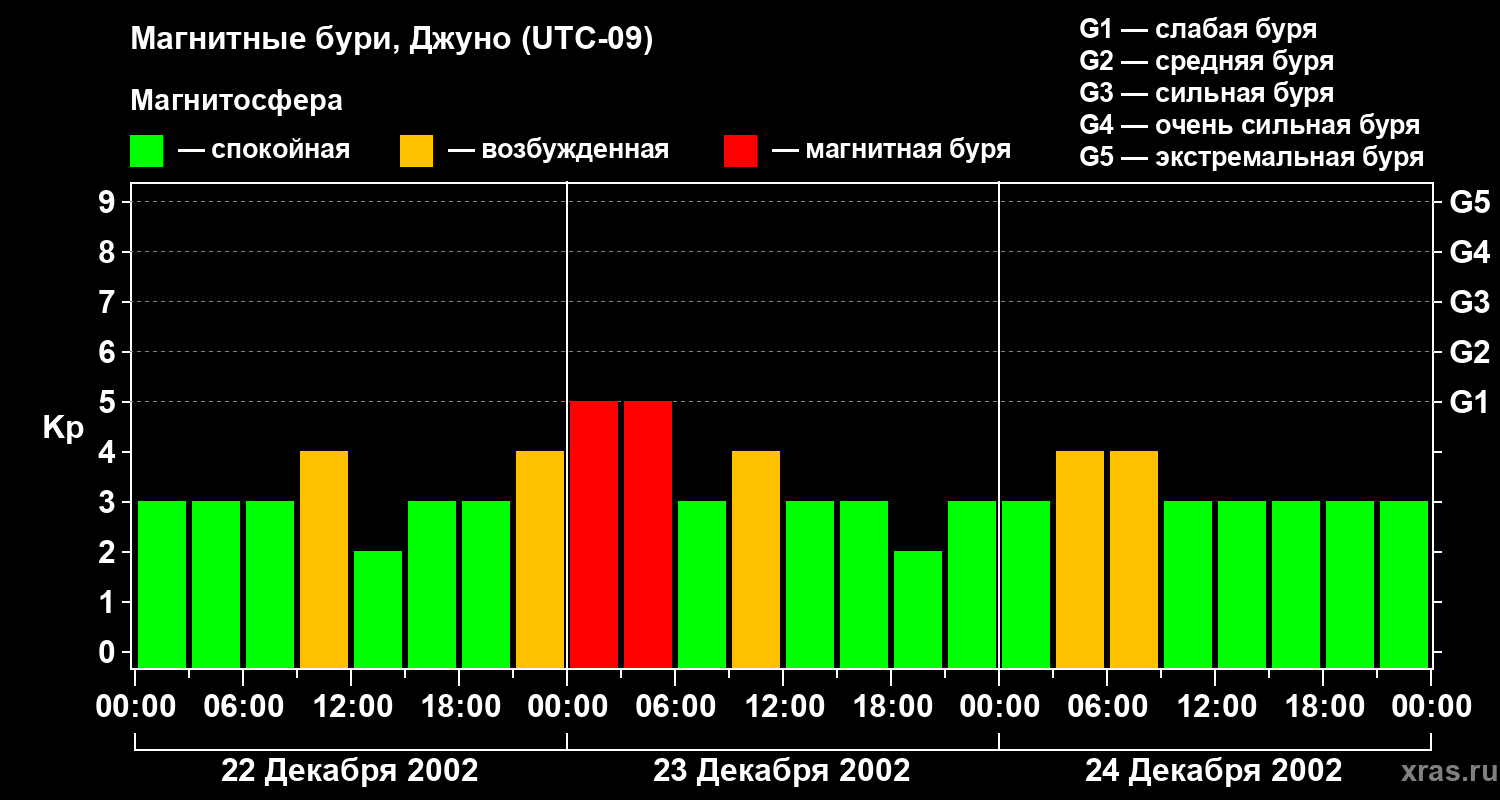 Изменения геомагнитного индекса Kp с 22 по 24 декабря 2002 года для средних широт
