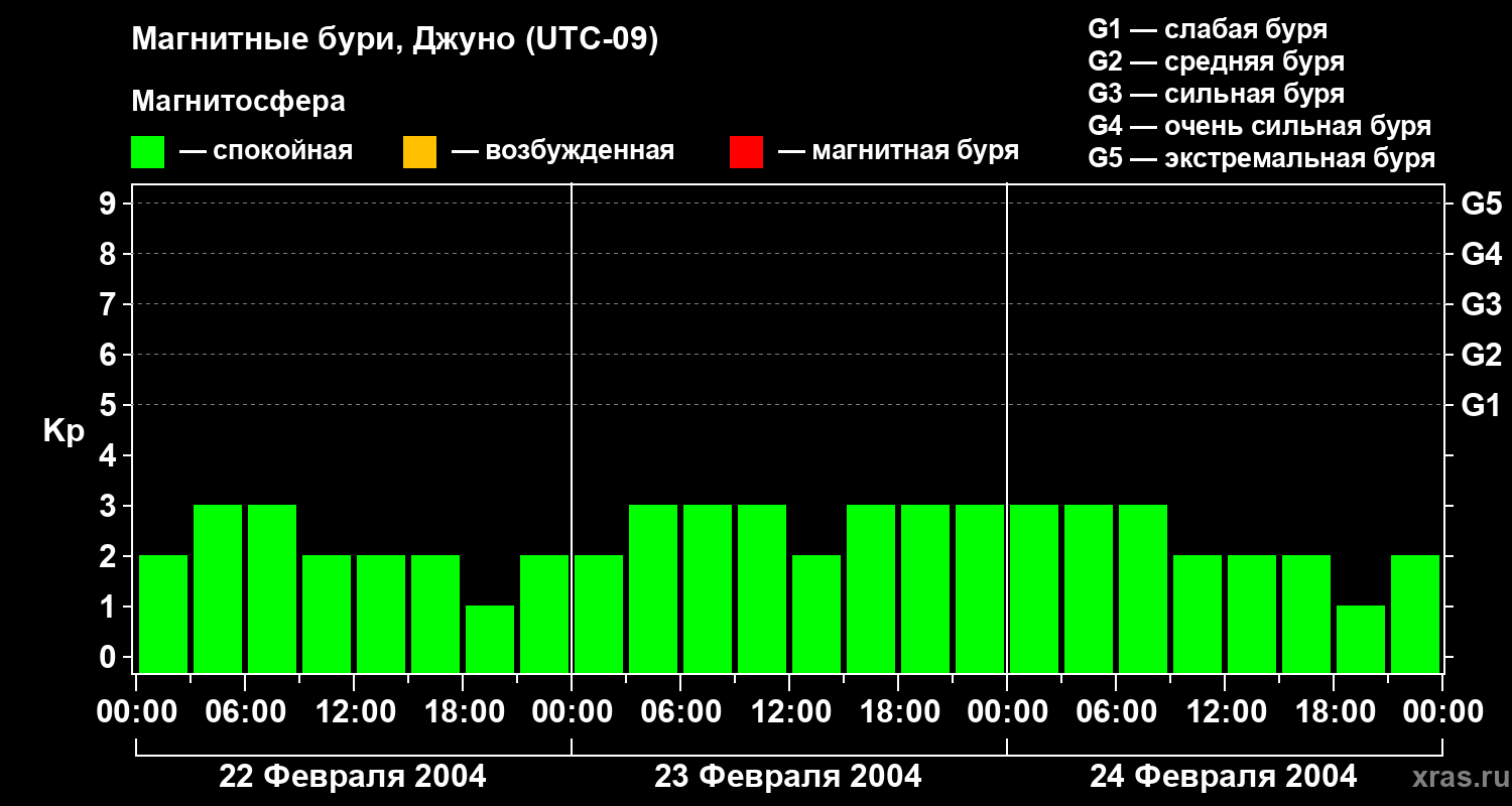 Изменения геомагнитного индекса Kp с 22 по 24 февраля 2004 года для средних широт
