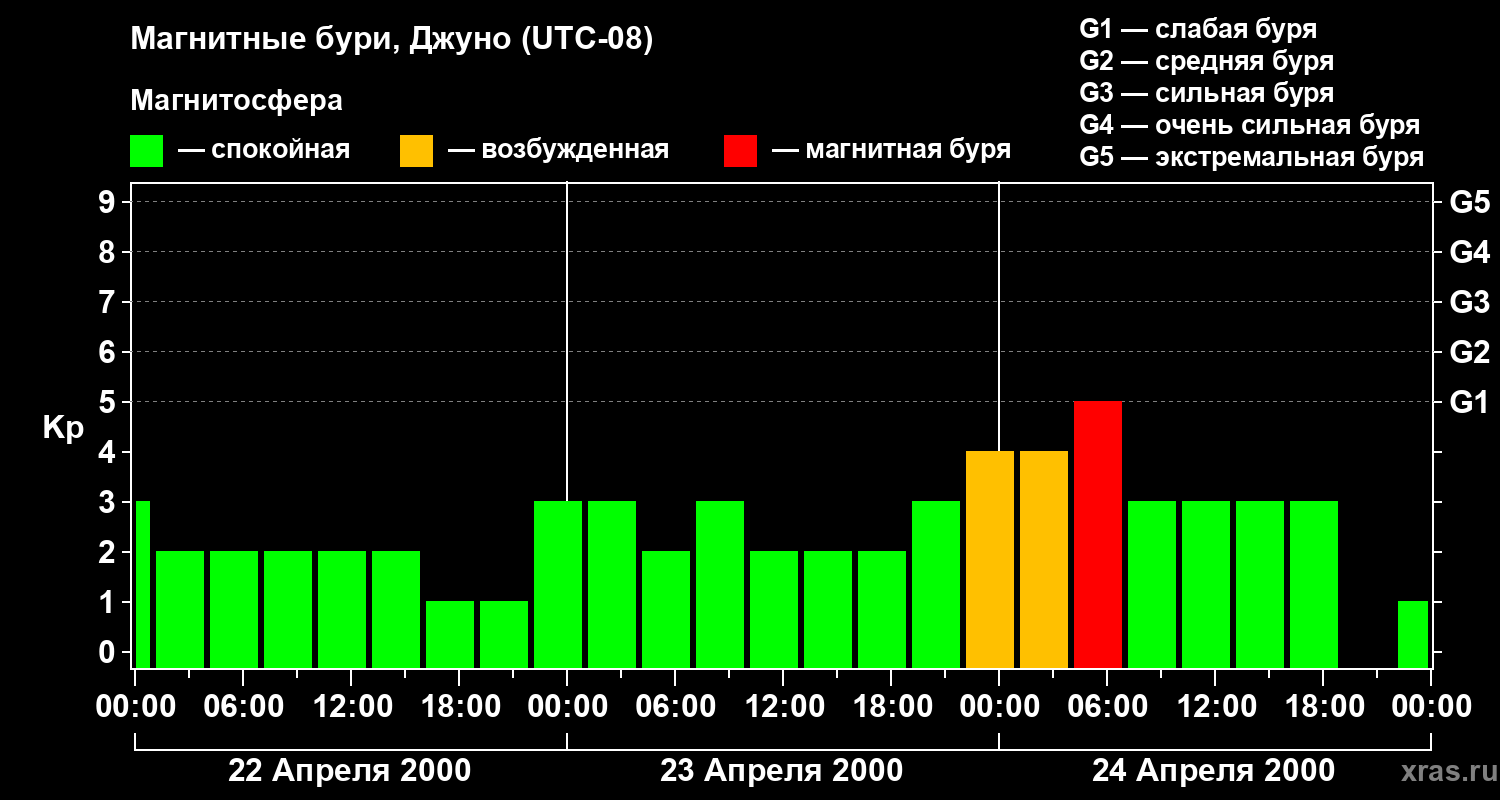Изменения геомагнитного индекса Kp с 22 по 24 апреля 2000 года для средних широт