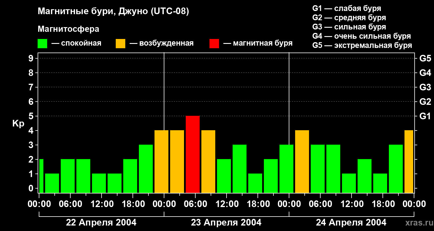 Изменения геомагнитного индекса Kp с 22 по 24 апреля 2004 года для средних широт