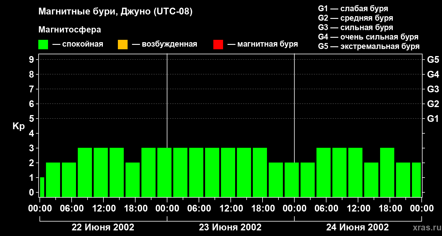 Изменения геомагнитного индекса Kp с 22 по 24 июня 2002 года для средних широт
