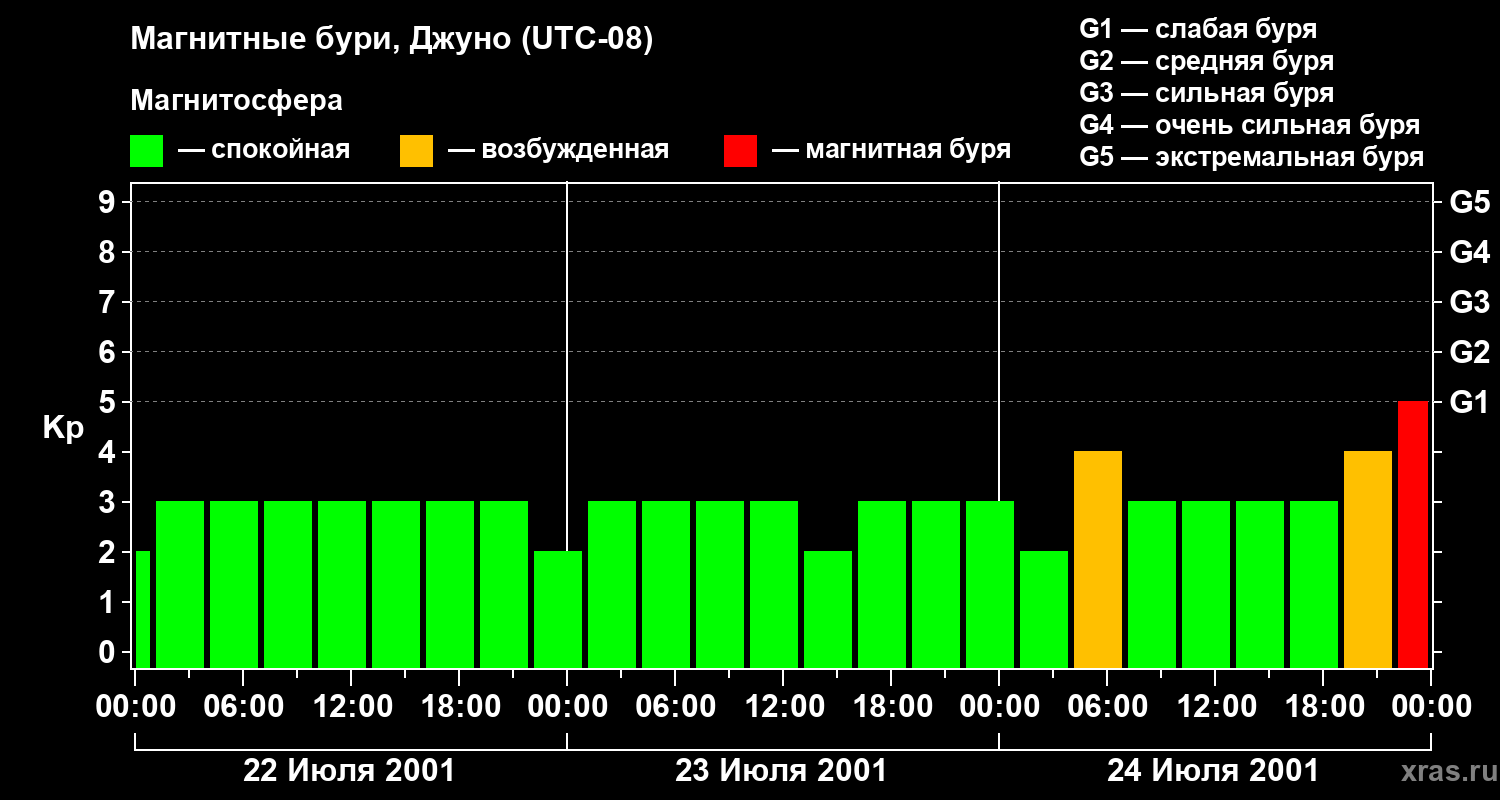 Изменения геомагнитного индекса Kp с 22 по 24 июля 2001 года для средних широт