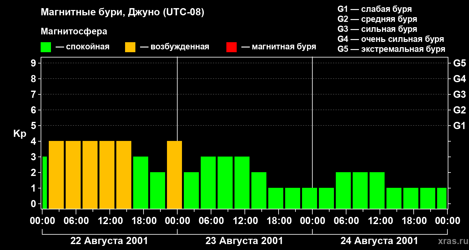 Изменения геомагнитного индекса Kp с 22 по 24 августа 2001 года для средних широт