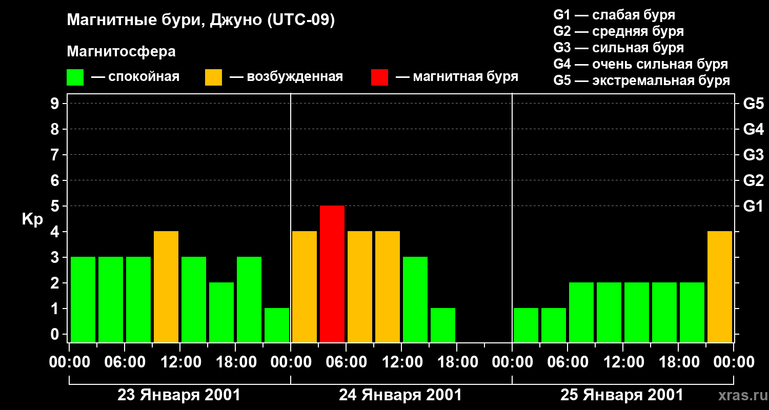 Изменения геомагнитного индекса Kp с 23 по 25 января 2001 года для средних широт