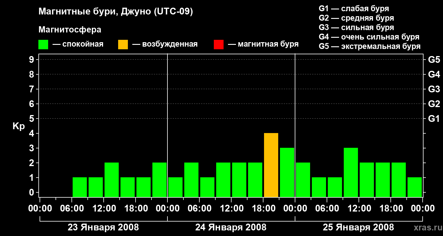 Изменения геомагнитного индекса Kp с 23 по 25 января 2008 года для средних широт