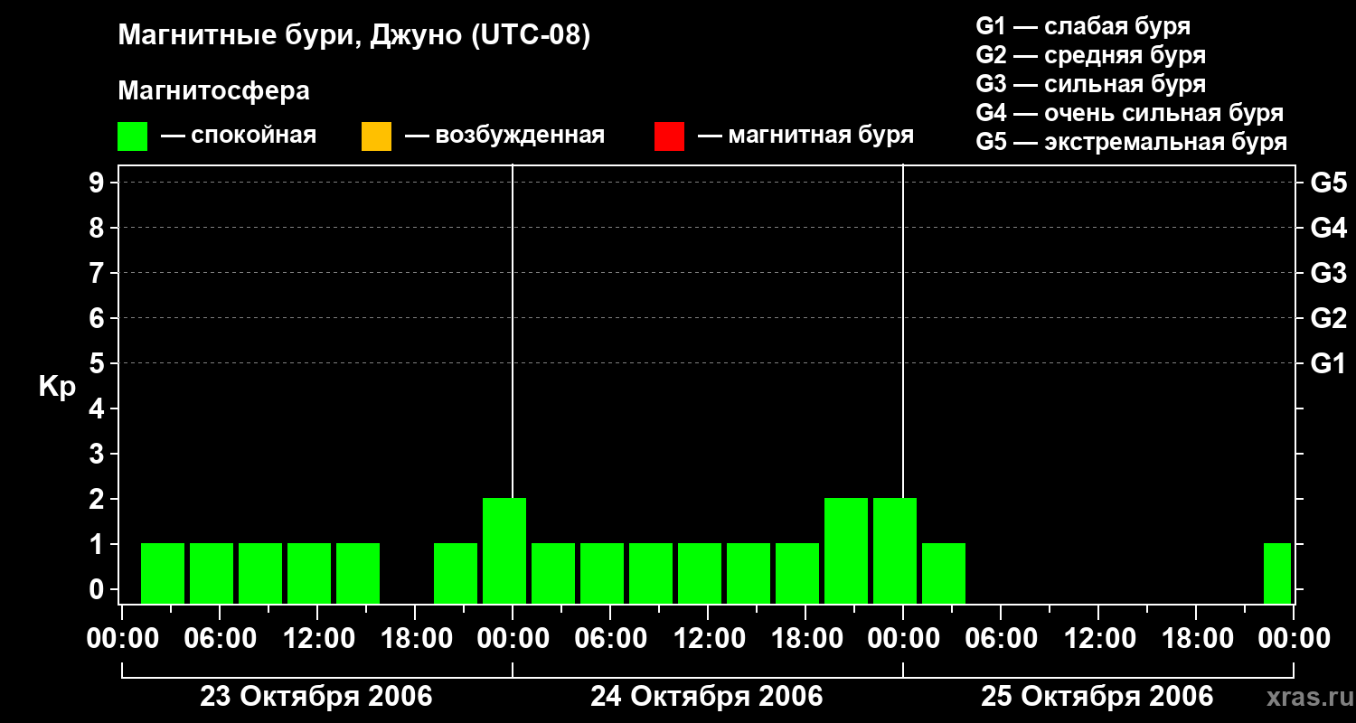 Изменения геомагнитного индекса Kp с 23 по 25 октября 2006 года для средних широт