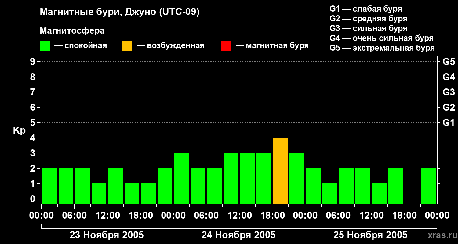 Изменения геомагнитного индекса Kp с 23 по 25 ноября 2005 года для средних широт