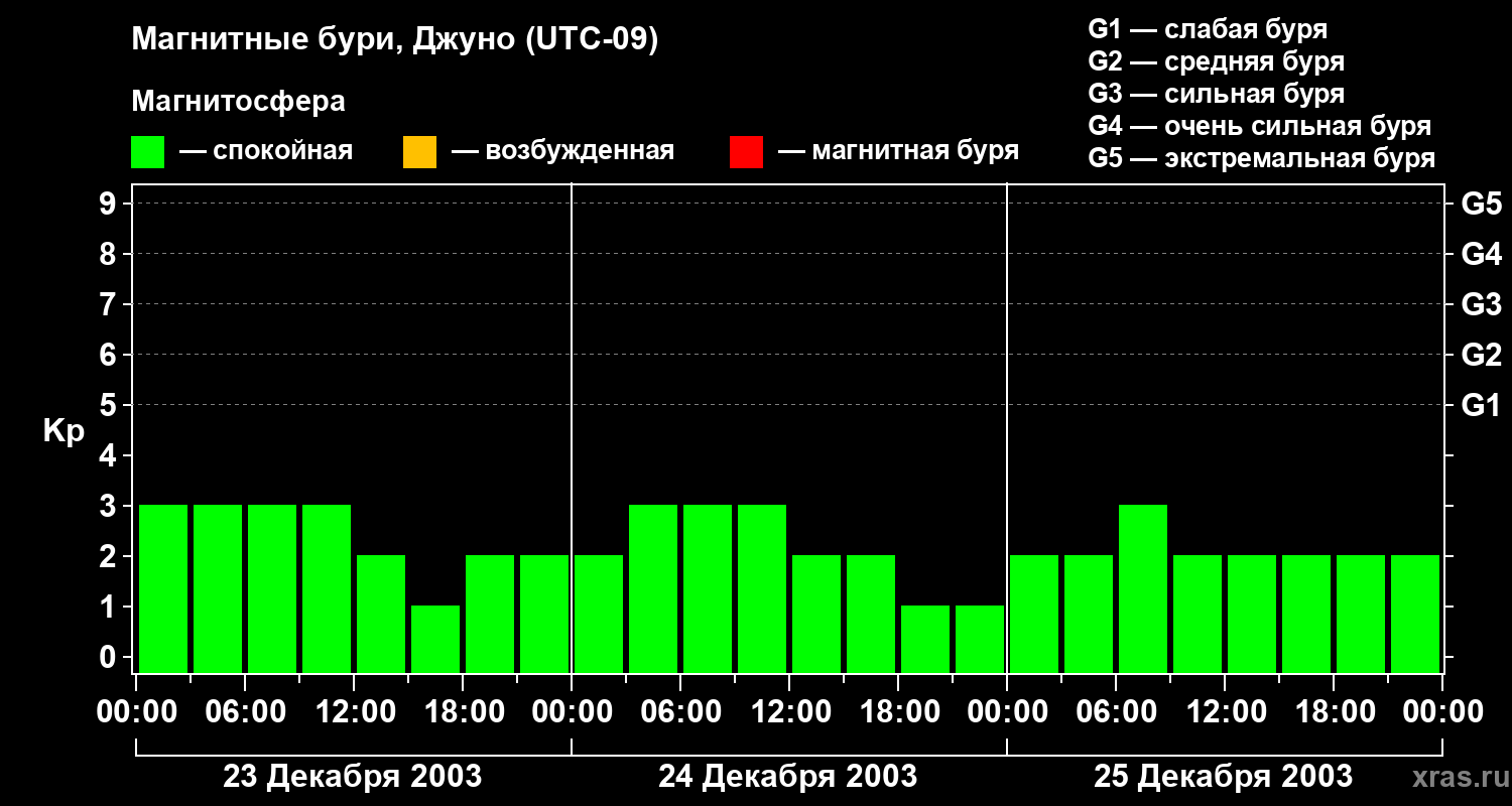 Изменения геомагнитного индекса Kp с 23 по 25 декабря 2003 года для средних широт