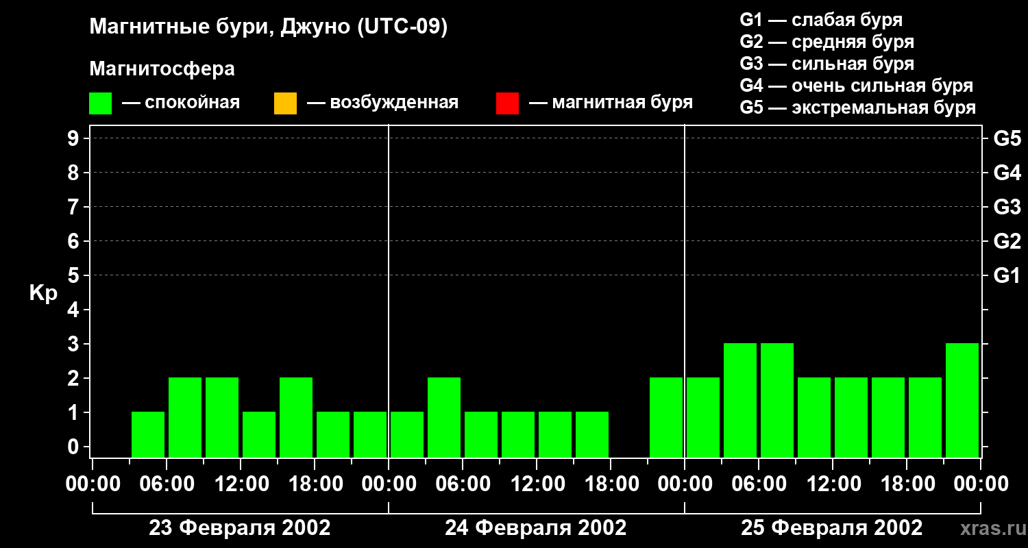 Изменения геомагнитного индекса Kp с 23 по 25 февраля 2002 года для средних широт