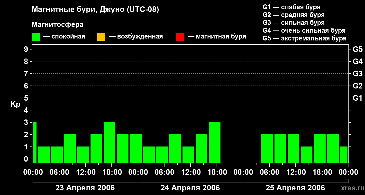 Изменения геомагнитного индекса Kp с 23 по 25 апреля 2006 года для средних широт