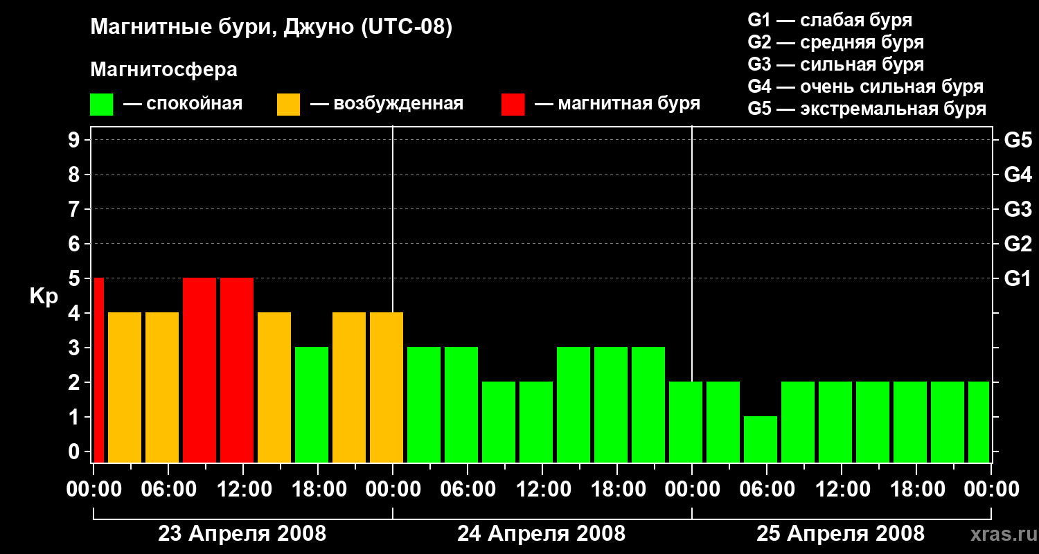 Изменения геомагнитного индекса Kp с 23 по 25 апреля 2008 года для средних широт