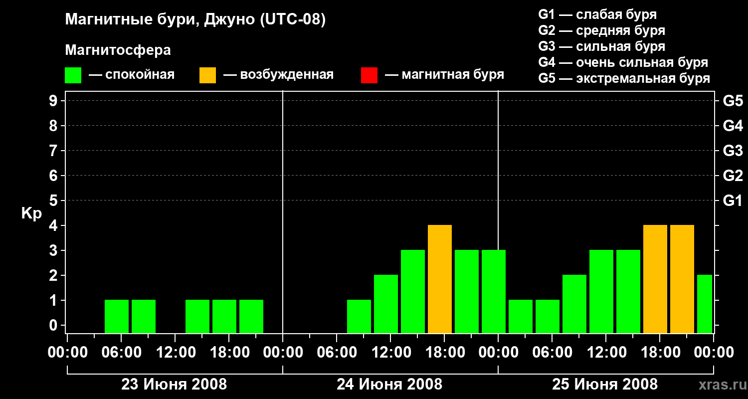 Изменения геомагнитного индекса Kp с 23 по 25 июня 2008 года для средних широт