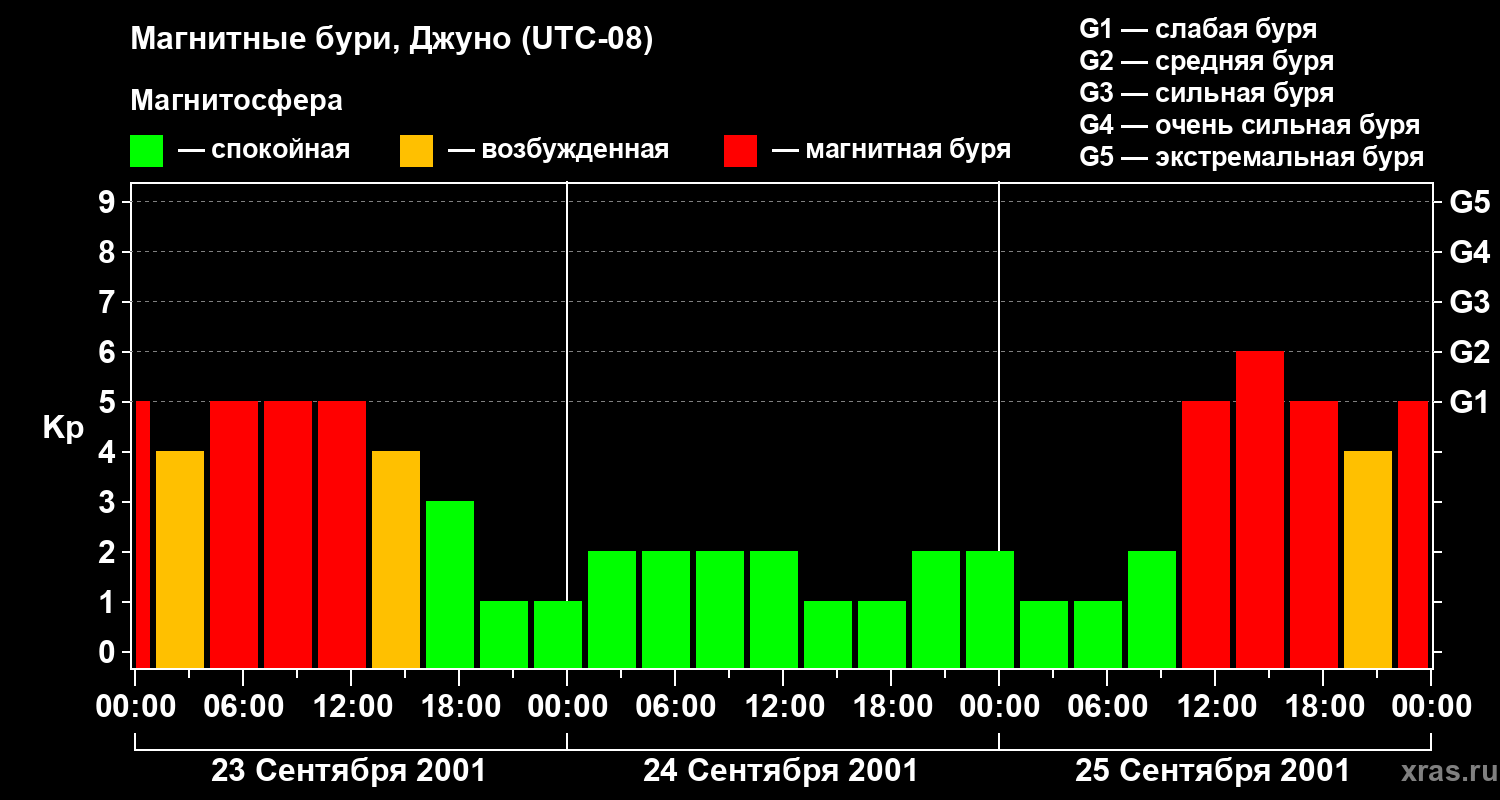 Изменения геомагнитного индекса Kp с 23 по 25 сентября 2001 года для средних широт