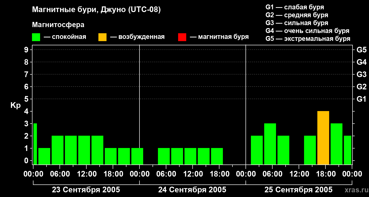 Изменения геомагнитного индекса Kp с 23 по 25 сентября 2005 года для средних широт