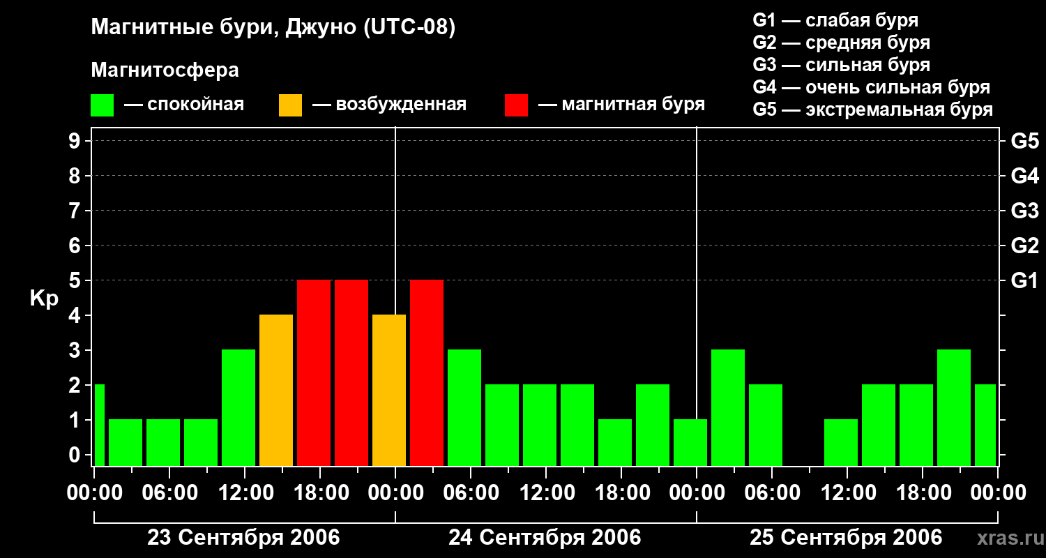 Изменения геомагнитного индекса Kp с 23 по 25 сентября 2006 года для средних широт