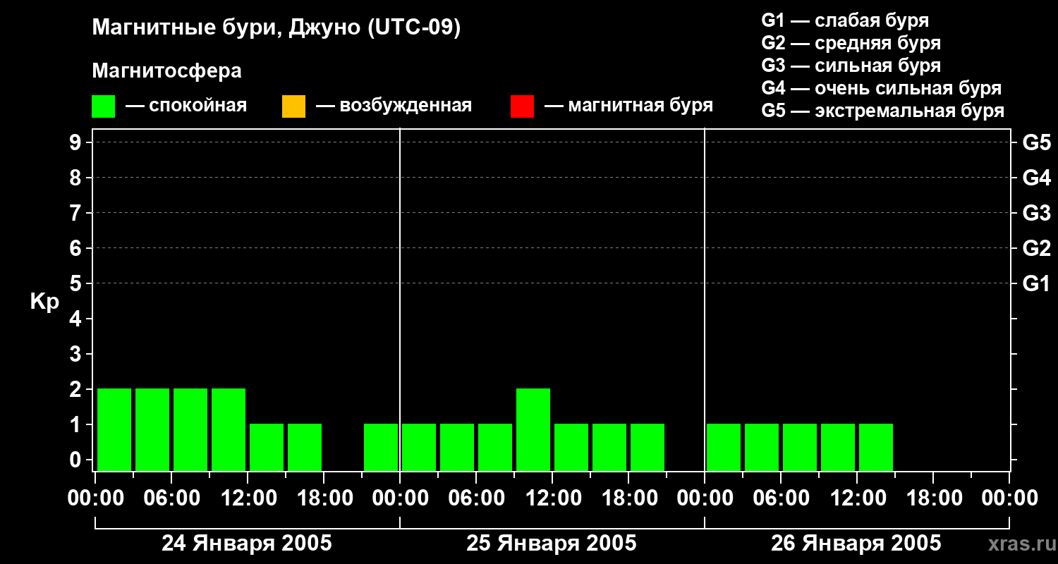 Изменения геомагнитного индекса Kp с 24 по 26 января 2005 года для средних широт