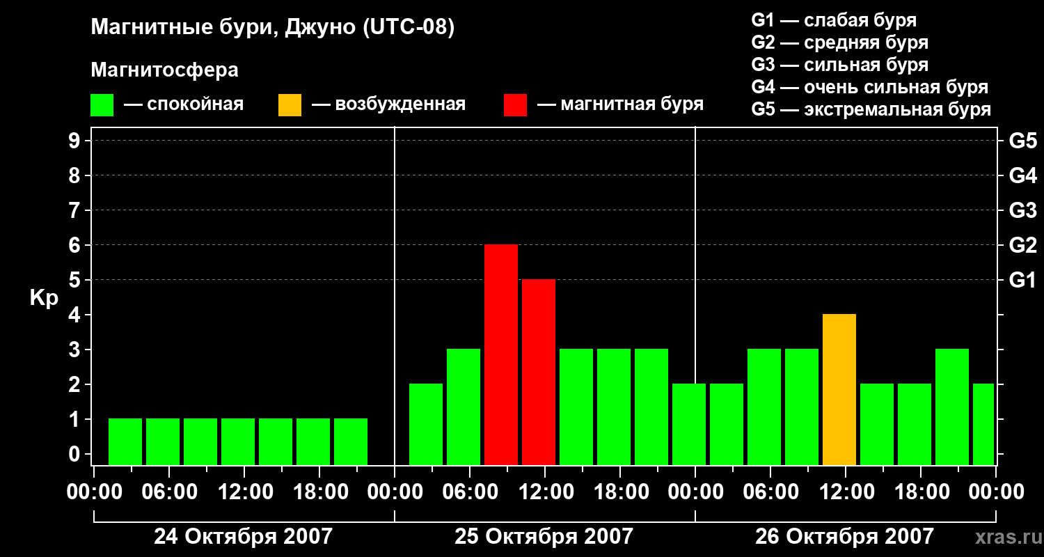Изменения геомагнитного индекса Kp с 24 по 26 октября 2007 года для средних широт