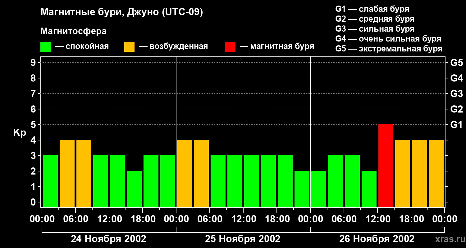 Изменения геомагнитного индекса Kp с 24 по 26 ноября 2002 года для средних широт
