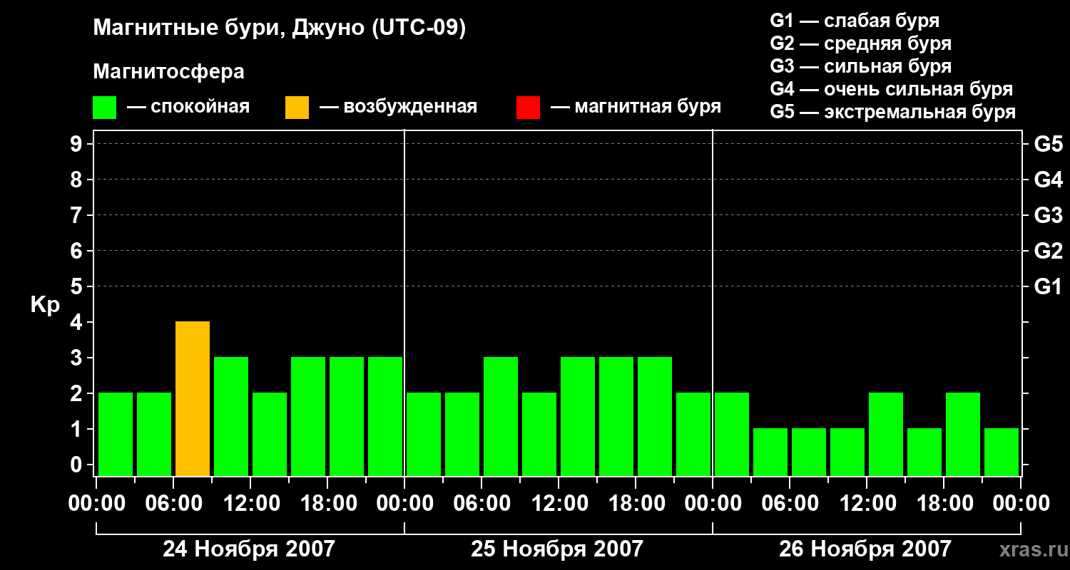 Изменения геомагнитного индекса Kp с 24 по 26 ноября 2007 года для средних широт