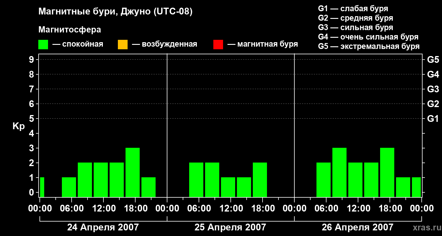 Изменения геомагнитного индекса Kp с 24 по 26 апреля 2007 года для средних широт