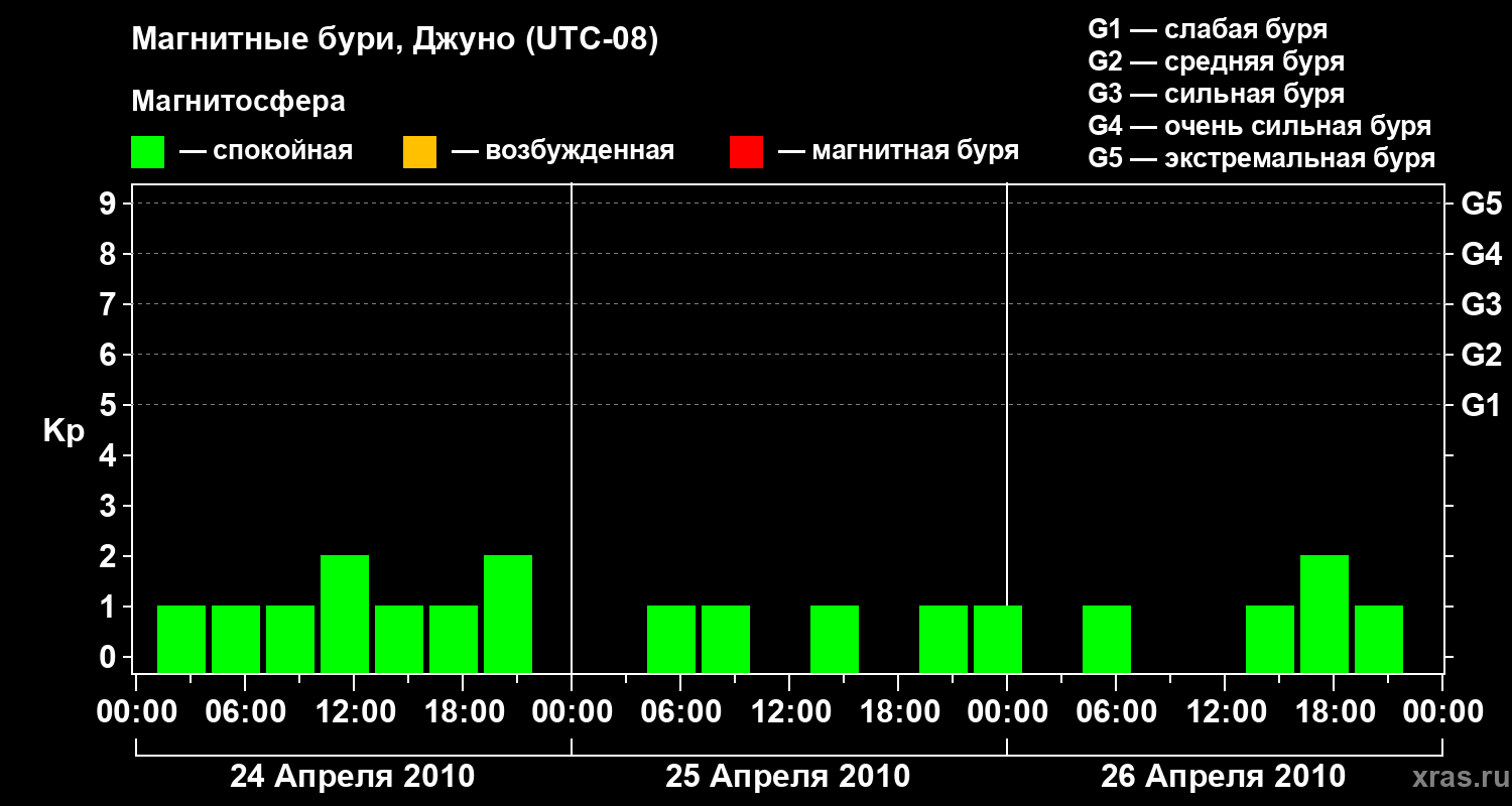 Изменения геомагнитного индекса Kp с 24 по 26 апреля 2010 года для средних широт