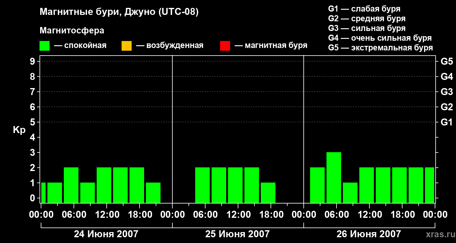 Изменения геомагнитного индекса Kp с 24 по 26 июня 2007 года для средних широт