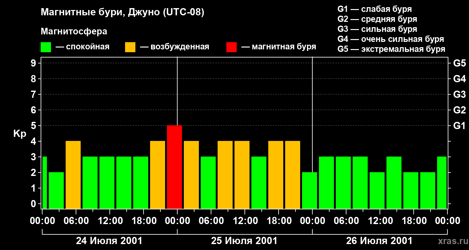 Изменения геомагнитного индекса Kp с 24 по 26 июля 2001 года для средних широт