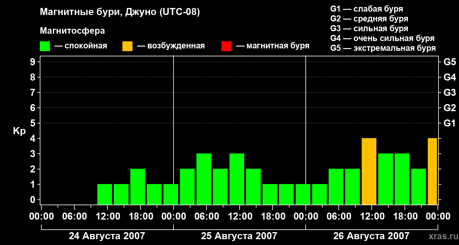 Изменения геомагнитного индекса Kp с 24 по 26 августа 2007 года для средних широт