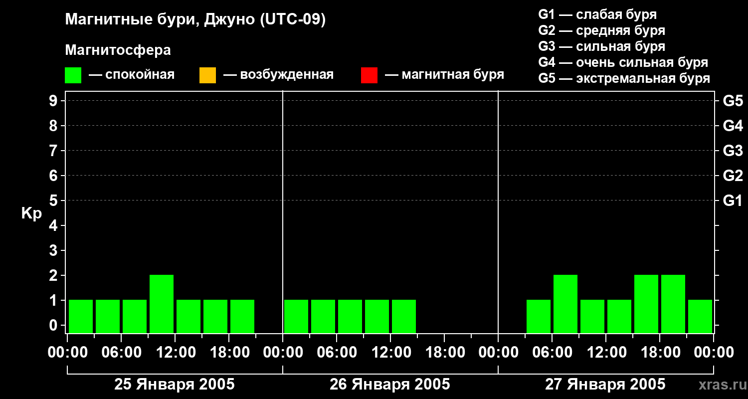Изменения геомагнитного индекса Kp с 25 по 27 января 2005 года для средних широт