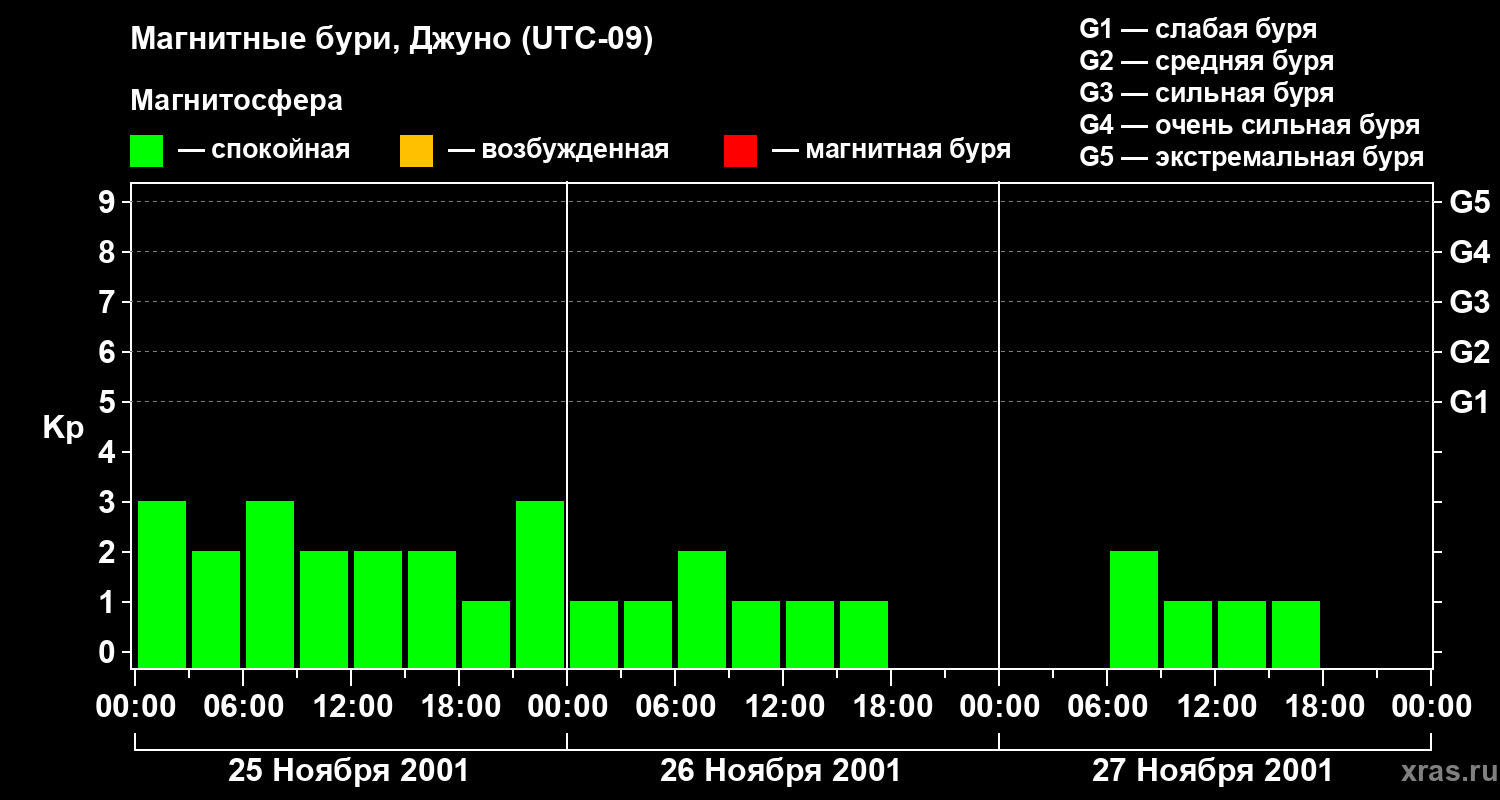 Изменения геомагнитного индекса Kp с 25 по 27 ноября 2001 года для средних широт