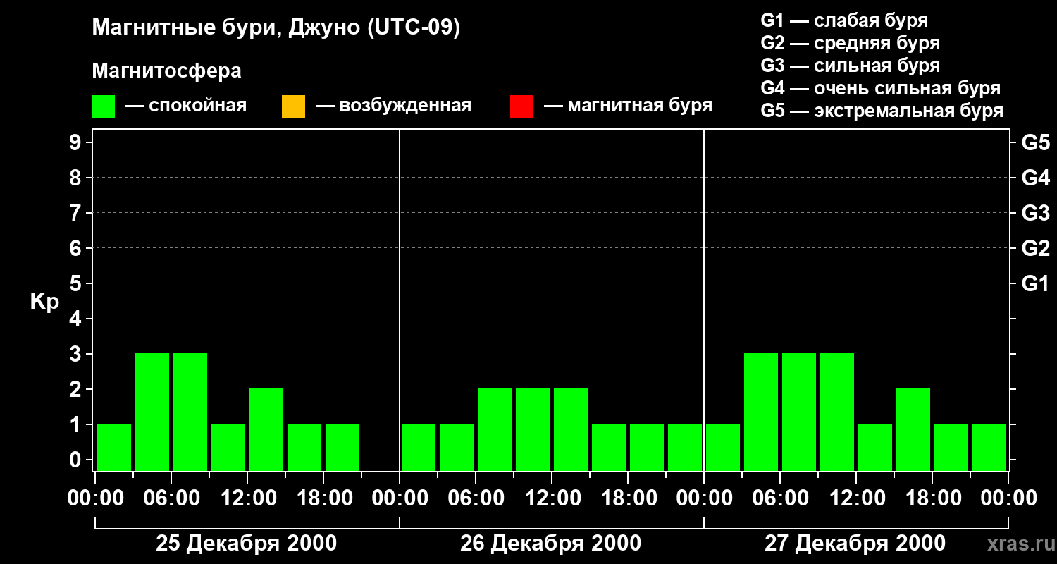 Изменения геомагнитного индекса Kp с 25 по 27 декабря 2000 года для средних широт