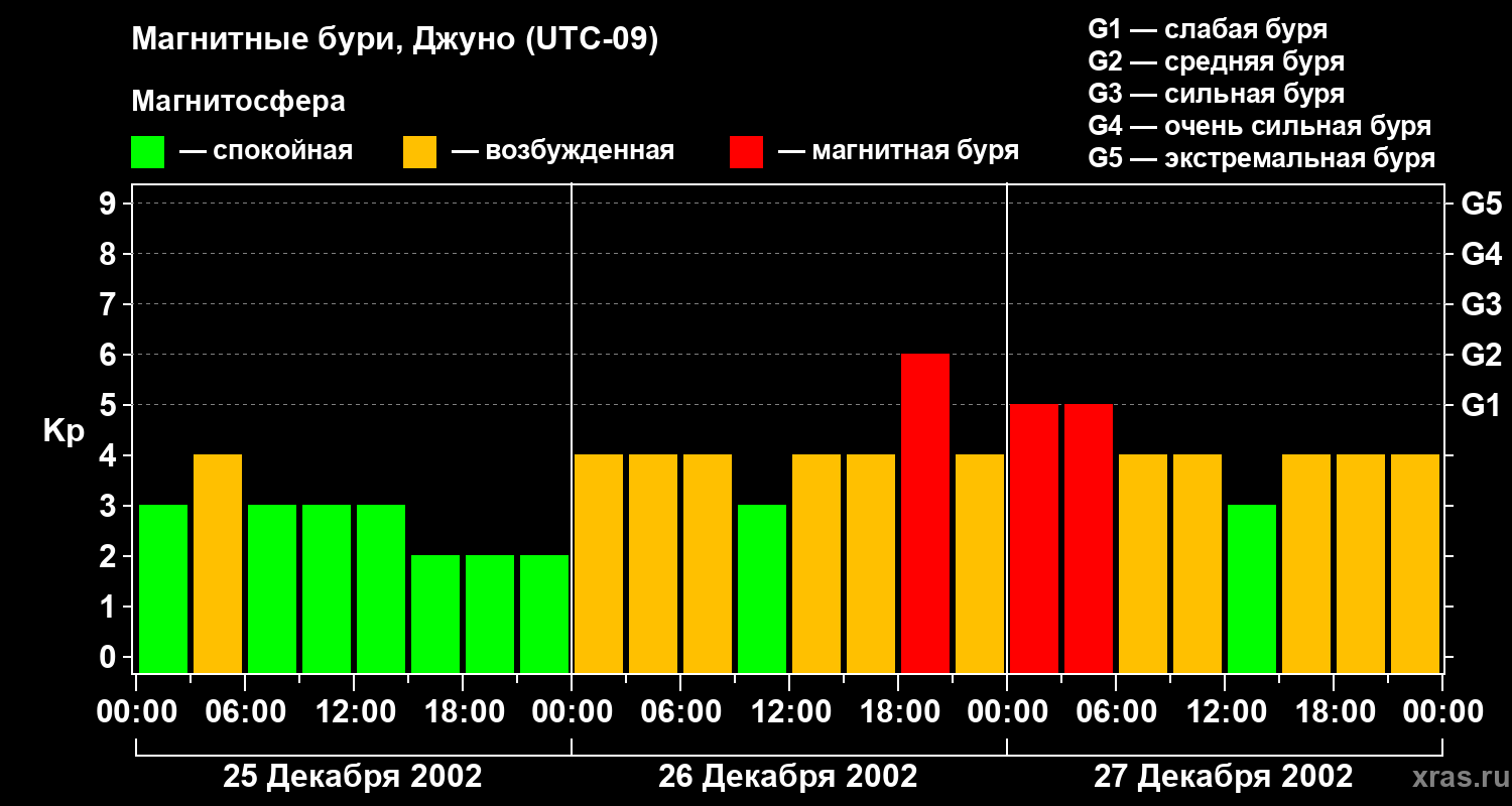 Изменения геомагнитного индекса Kp с 25 по 27 декабря 2002 года для средних широт