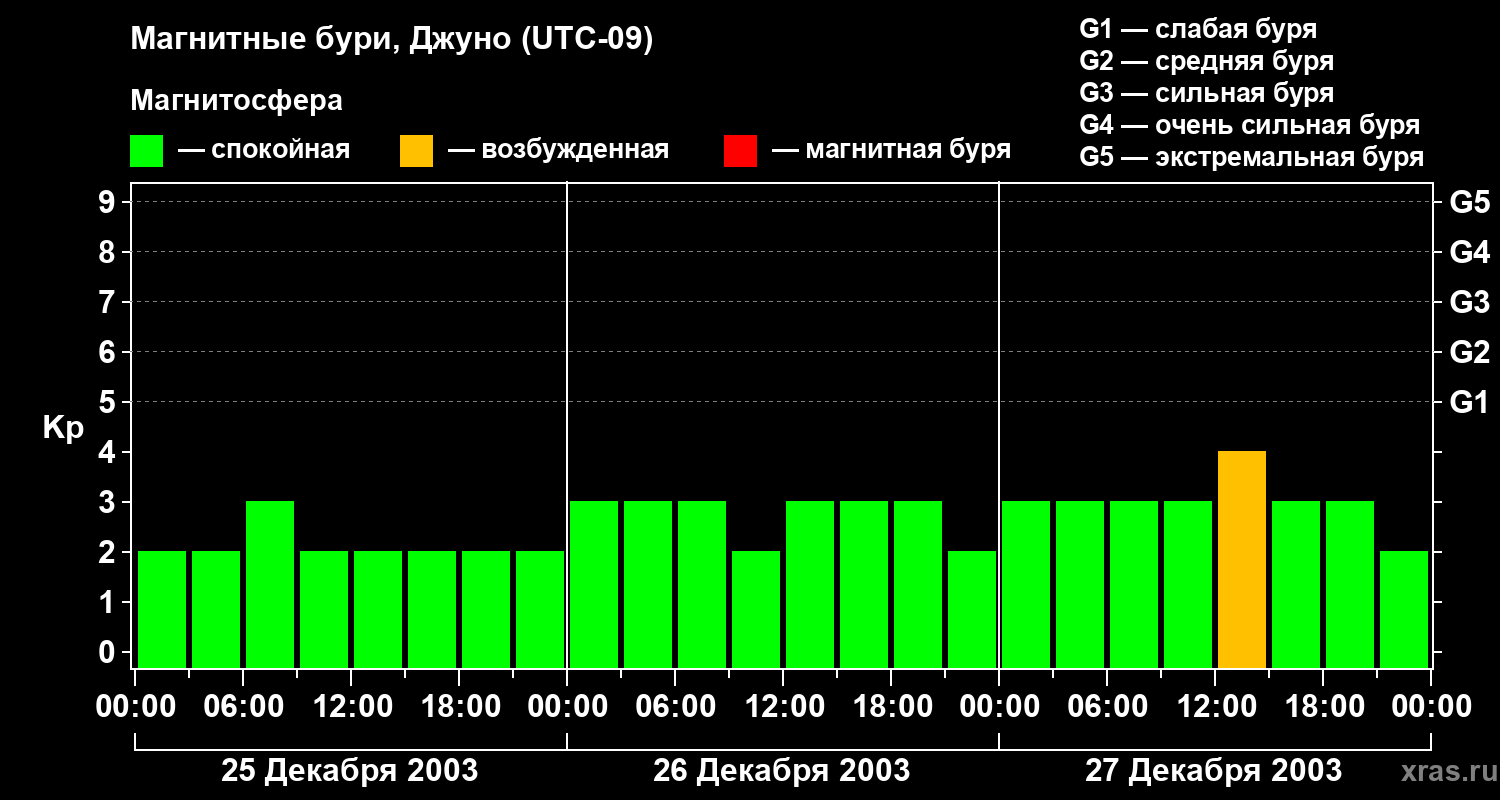 Изменения геомагнитного индекса Kp с 25 по 27 декабря 2003 года для средних широт