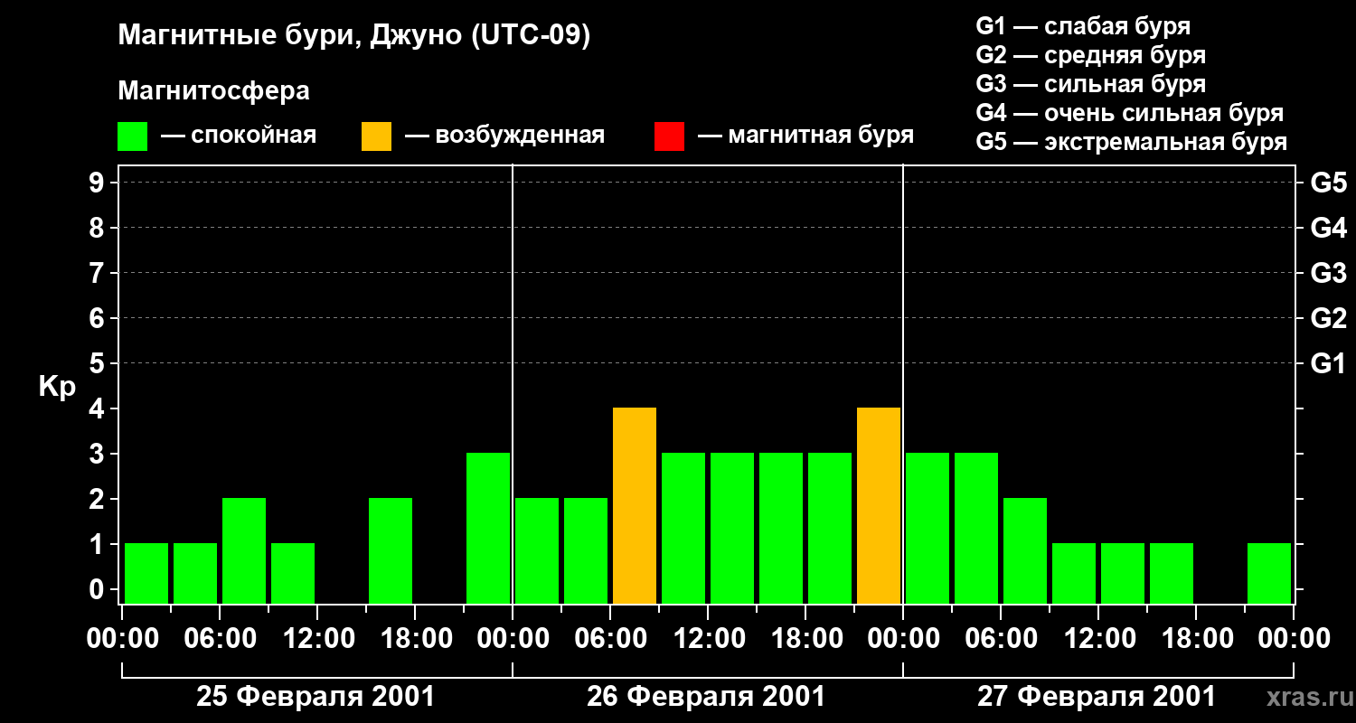 Изменения геомагнитного индекса Kp с 25 по 27 февраля 2001 года для средних широт
